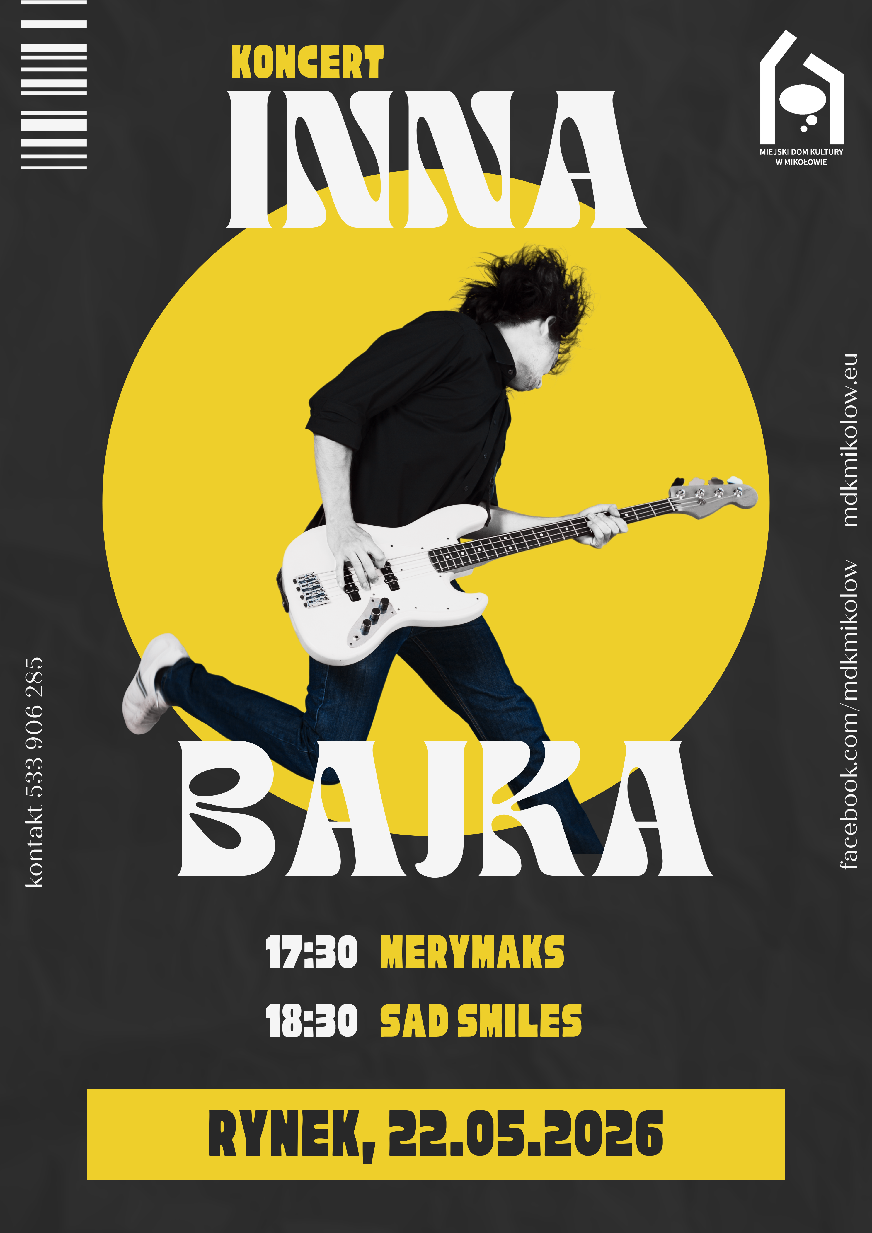 22 maja od godz. 17.30 na mikołowskim Rynku odbędzie się pierwszy z cyklu młodzieżowych koncertów INNA BAJKA. O godz. 17.30 wystąpi duet MeryMaks, a o 18.30 zespół Sad Smiles. W przypadku niepogody koncert odbędzie się na naszej sali widowiskowej.