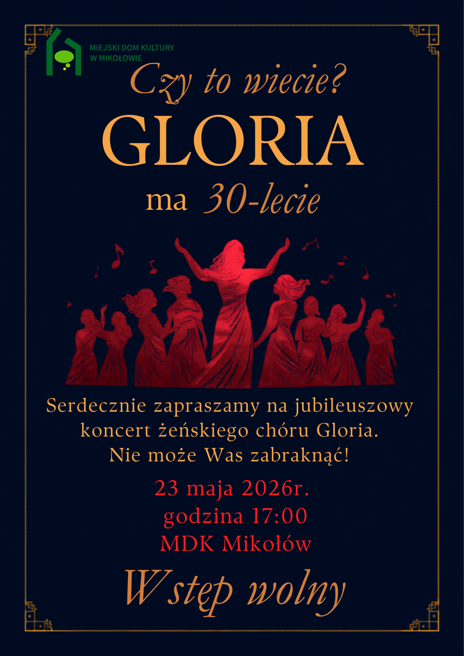 Czy to wiecie? Gloria ma 30-lecie! Nasz chór żeński GLORIA, działający pod dyrekcją Aldony Kciuk-Herberg, świętuje w tym roku swój jubileusz. Koncert z tej okazji odbędzie się w sobotę, 23 maja, o godz. 17.00. Serdecznie zapraszamy wszystkich melomanów.