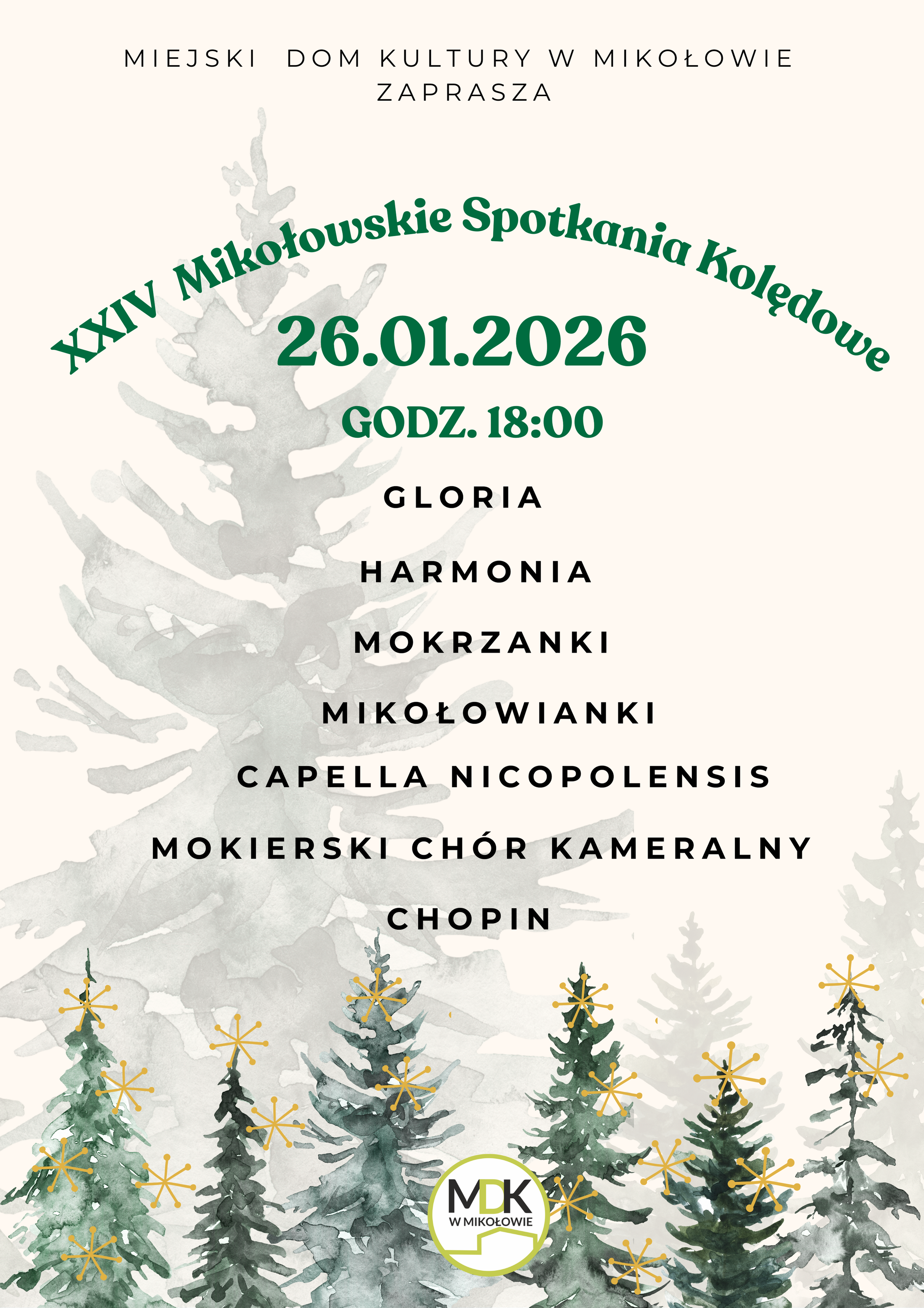 Tradycja kolędowania łączy pokolenia, przypomina o tym, co najpiękniejsze w tych dniach: o bliskości, wdzięczności i nadziei. Na naszej scenie pojawią się dobrze znane i lubiane chóry i zespoły: Mikołowianki, Mokrzanki, Gloria, Harmonia, Capella Nicopolensis, Chopin oraz Mokierski Chór Kameralny. Wspólnie sprawią, że dźwięki kolęd ponownie wypełnią salę, przynosząc ze sobą uśmiech, wzruszenie i radość wspólnego muzykowania.