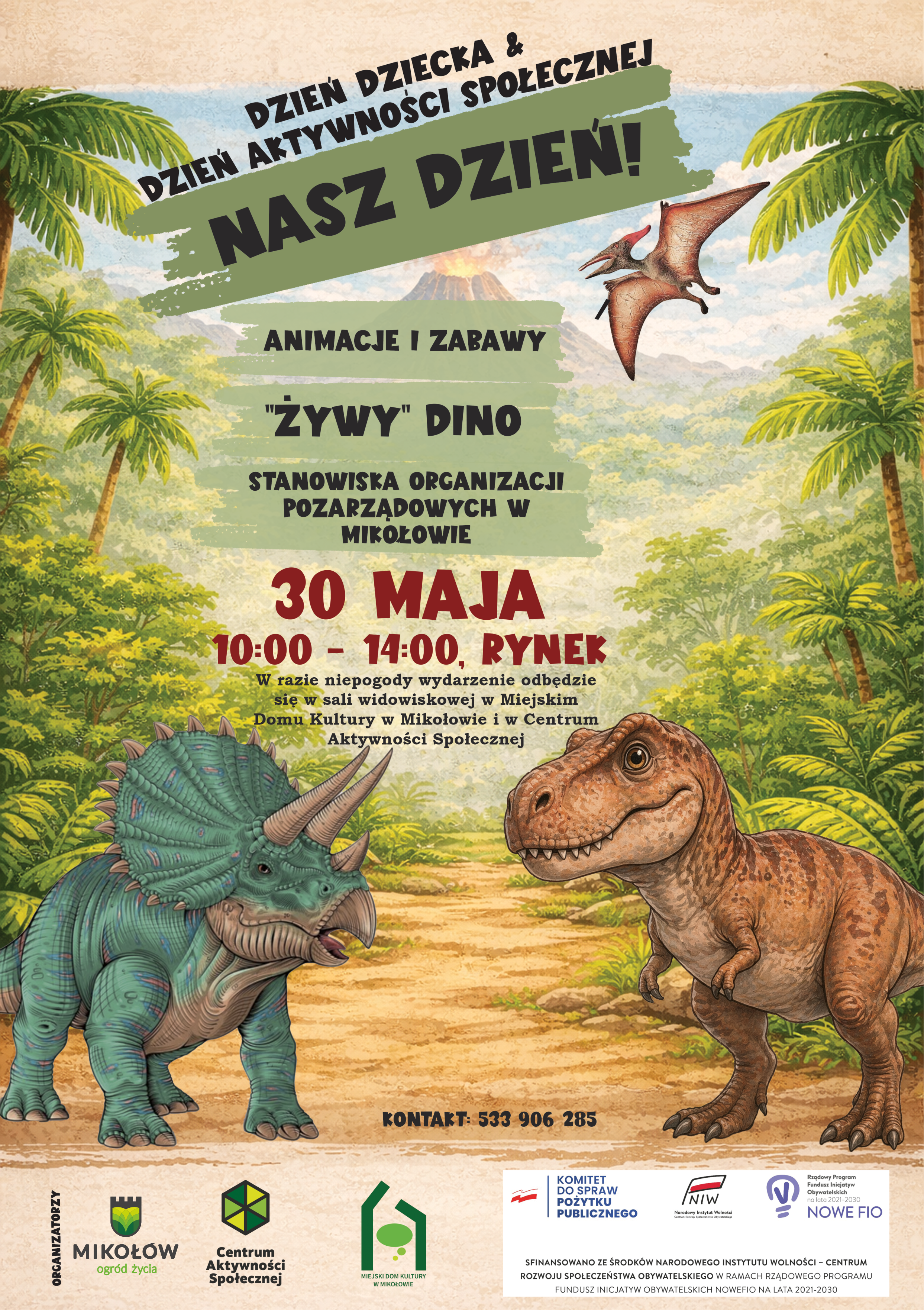 Zapraszamy wszystkie dzieci - te małe i te duże - w przededniu ich święta na imprezę z dinozaurami. Prehistoryczne gady ożyją na naszym Rynku 30 maja od godziny 10.00 do 14.00 i niczym udomowione będą zaciekawiać, fascynować i zapraszać do zabawy.