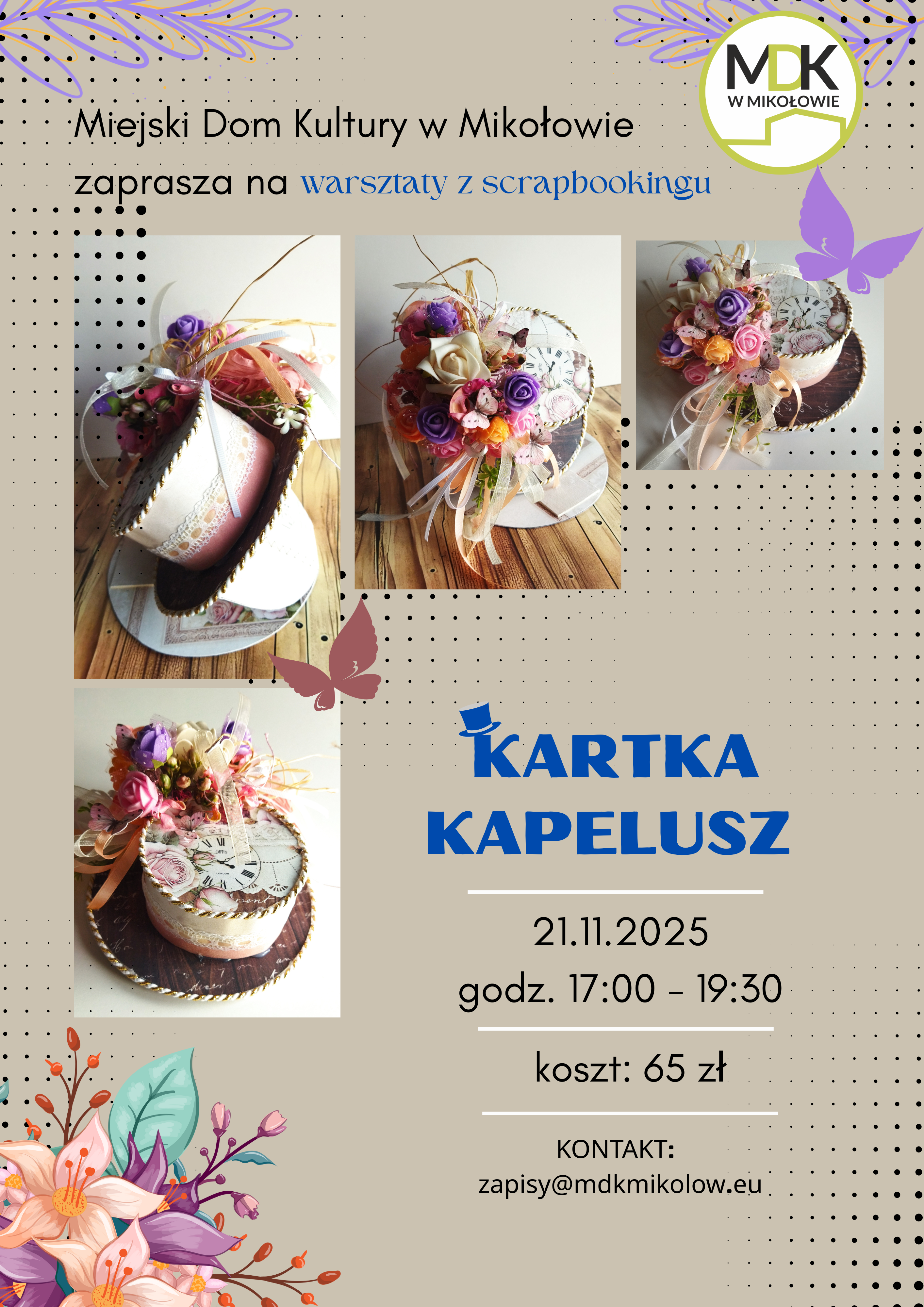 21 listopada w godzinach 17.00-19.30 zapraszamy na kolejne warsztaty ze scrapbookingu. Tym razem wykonamy kartkę w kształcie kapelusza o średnicy ok. 14 cm., w której po otwarciu znajdzie się miejsce na życzenia.