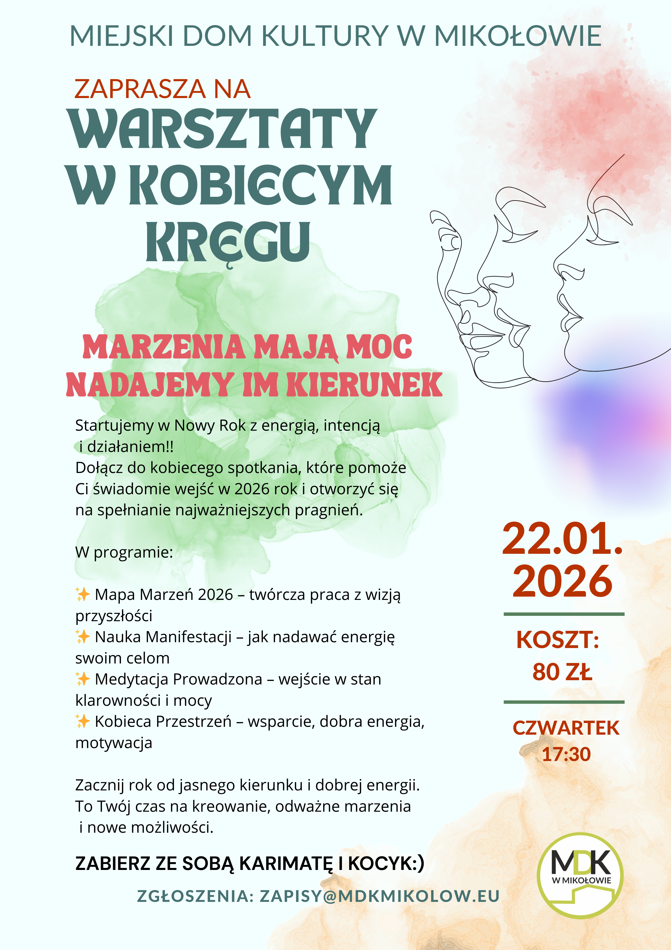 Cena warsztatów to 80 zł płatne przelewem na konto MDK. Zgłoszenia pod adresem zapisy@mdkmikolow.eu.