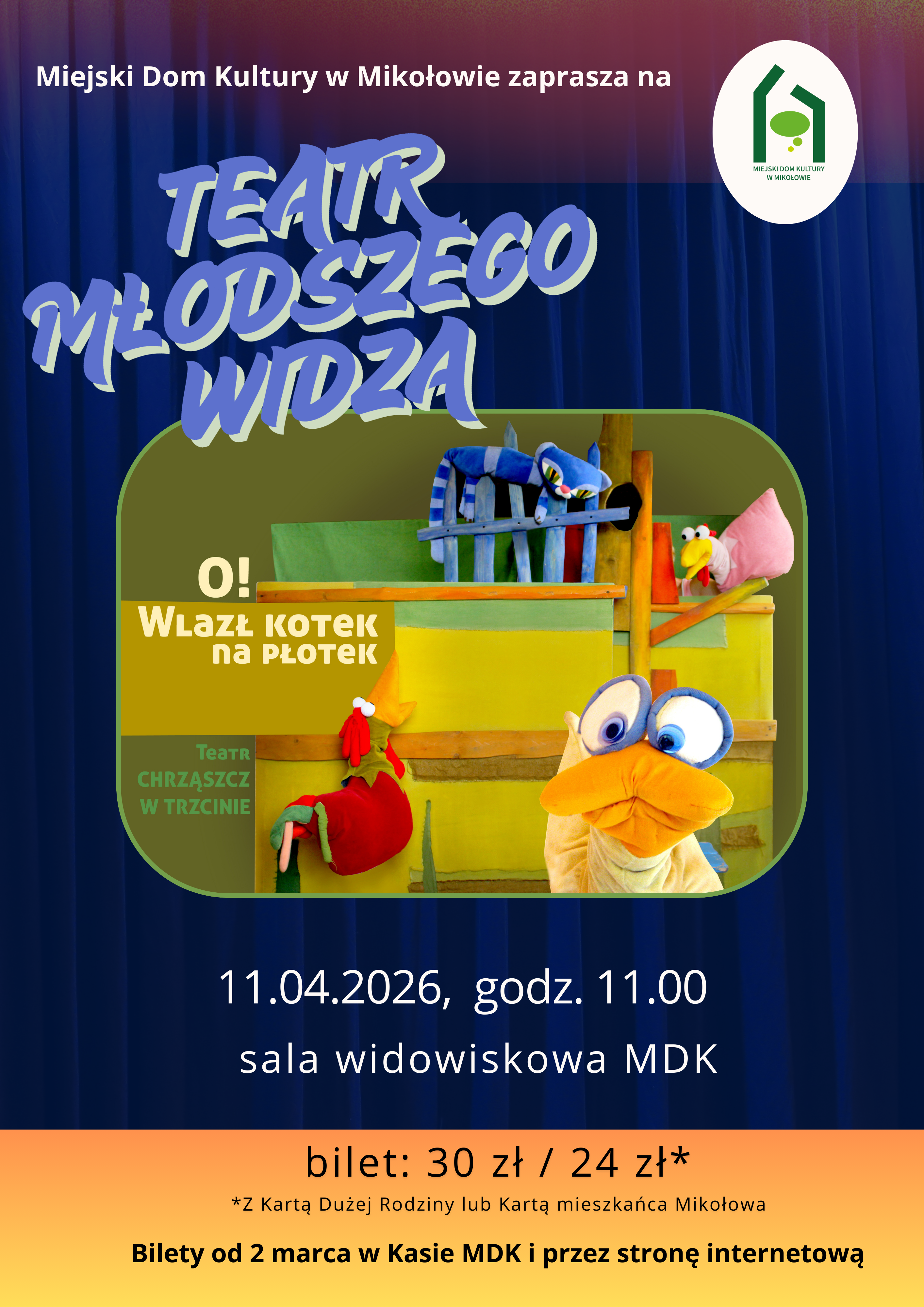 Zapraszamy dzieci już od 4. roku życia! Bilety w sprzedaży od 2 marca w Kasie oraz przez stronę MDK w cenie 30 zł (ulgowe w cenie 24 zł dla posiadaczy Karty Dużej Rodziny i Karty Mieszkańca Mikołowa dostępne wyłącznie w Kasie MDK). Link do strony z biletami znajduje się TUTAJ.