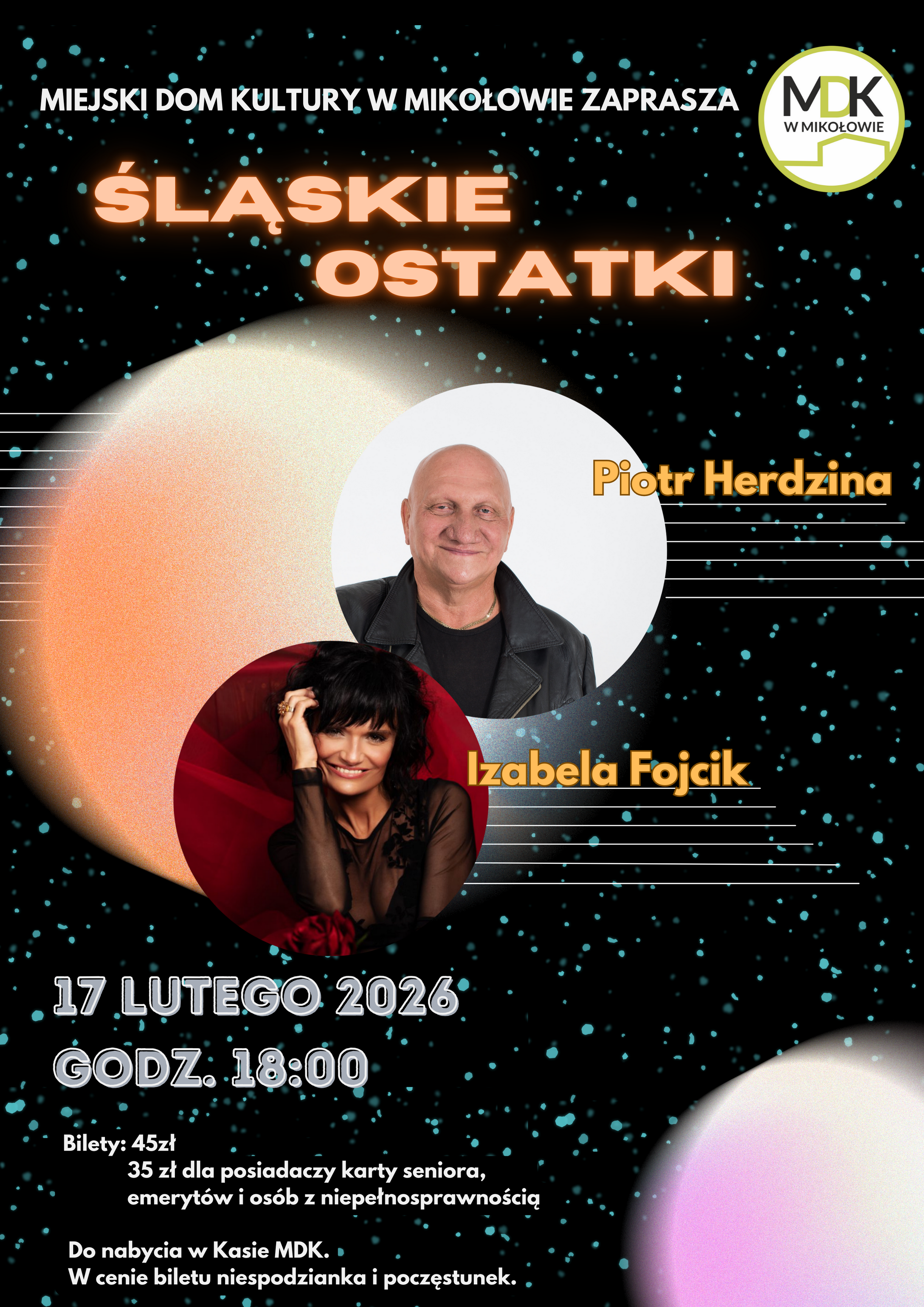 Jak Ostatki to tylko z MDK. W ten wyjątkowy wieczór wieńczący karnawał zapraszamy do MDK na koncert Piotra Herdziny oraz Izabeli Fojcik. Śląskie Ostatki to zawsze wspaniała zabawa! Do zobaczenia 17 lutego o godz. 18.00.