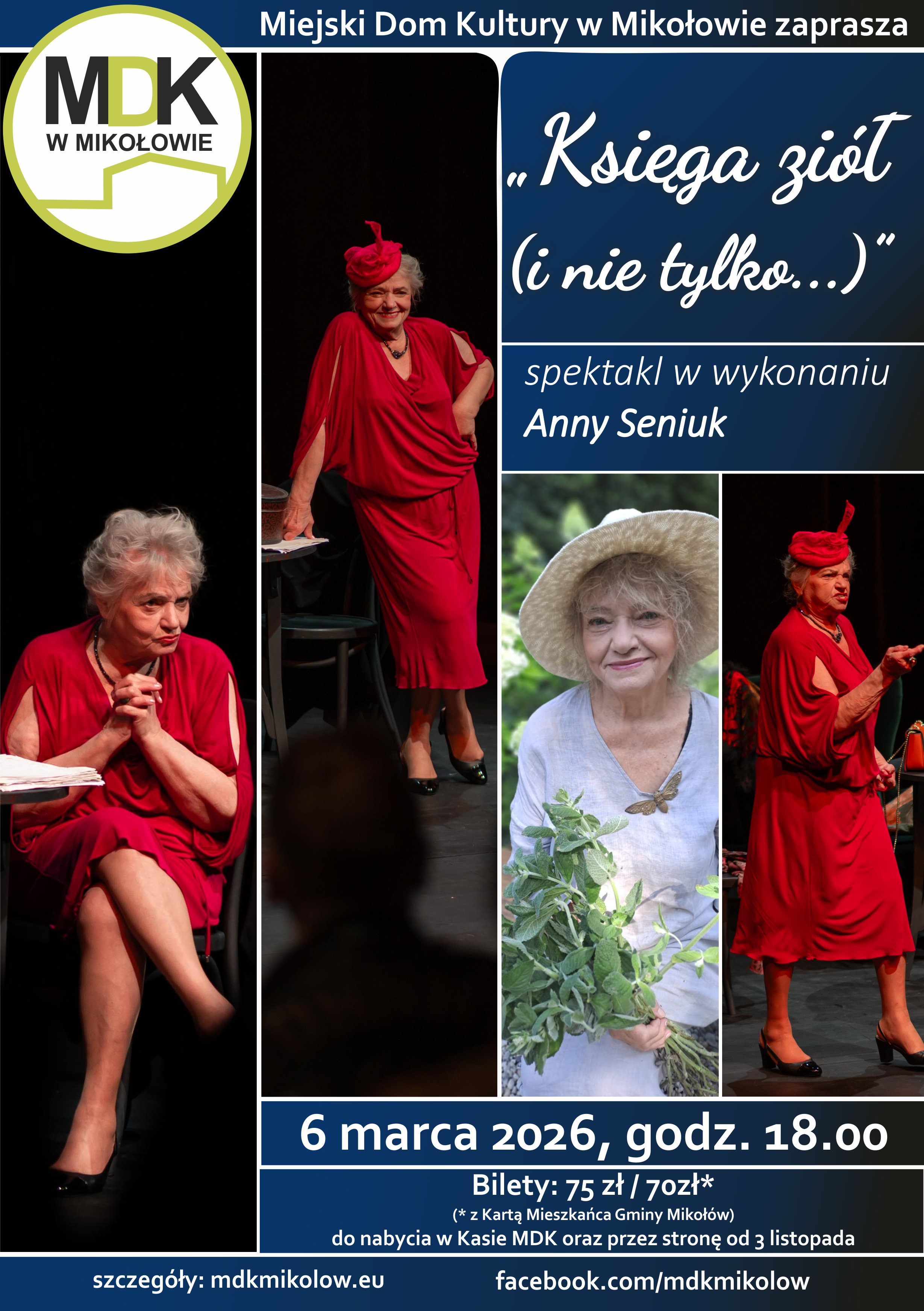 6 marca o godz. 18.00, w przededniu Dnia Kobiet, zapraszamy na spektakl "Księga ziół (i nie tylko...)" z wybitną i uwielbianą przez publiczność Anną Seniuk. Bilety w cenie 75 zł do nabycia w Kasie MDK i przez stronę od 3 listopada (ulgowe w cenie 70 zł dla posiadaczy Karty Mieszkańca Gminy Mikołów do nabycia w Kasie).