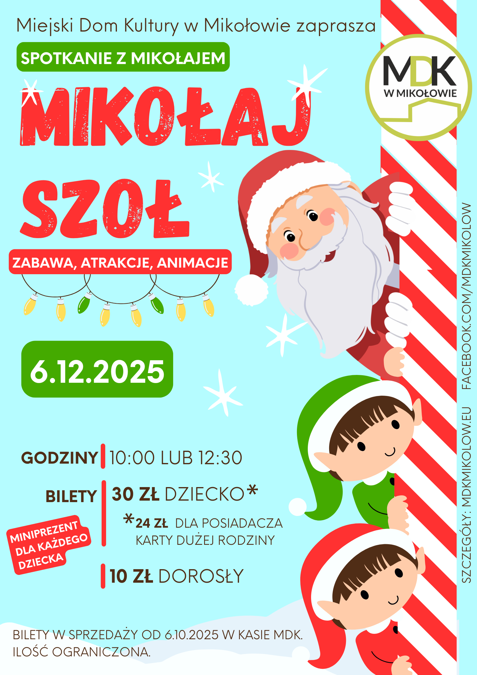 Bilety w Kasie MDK i na naszej stronie (link do zakładki "Bilety" TUTAJ) już w sprzedaży. Bilet dziecięcy z miniprezentem w cenie 30 zł (dla posiadaczy Karty Dużej Rodziny w cenie 24 zł dostępne wyłącznie w Kasie), bilet dla opiekuna za 10 zł.