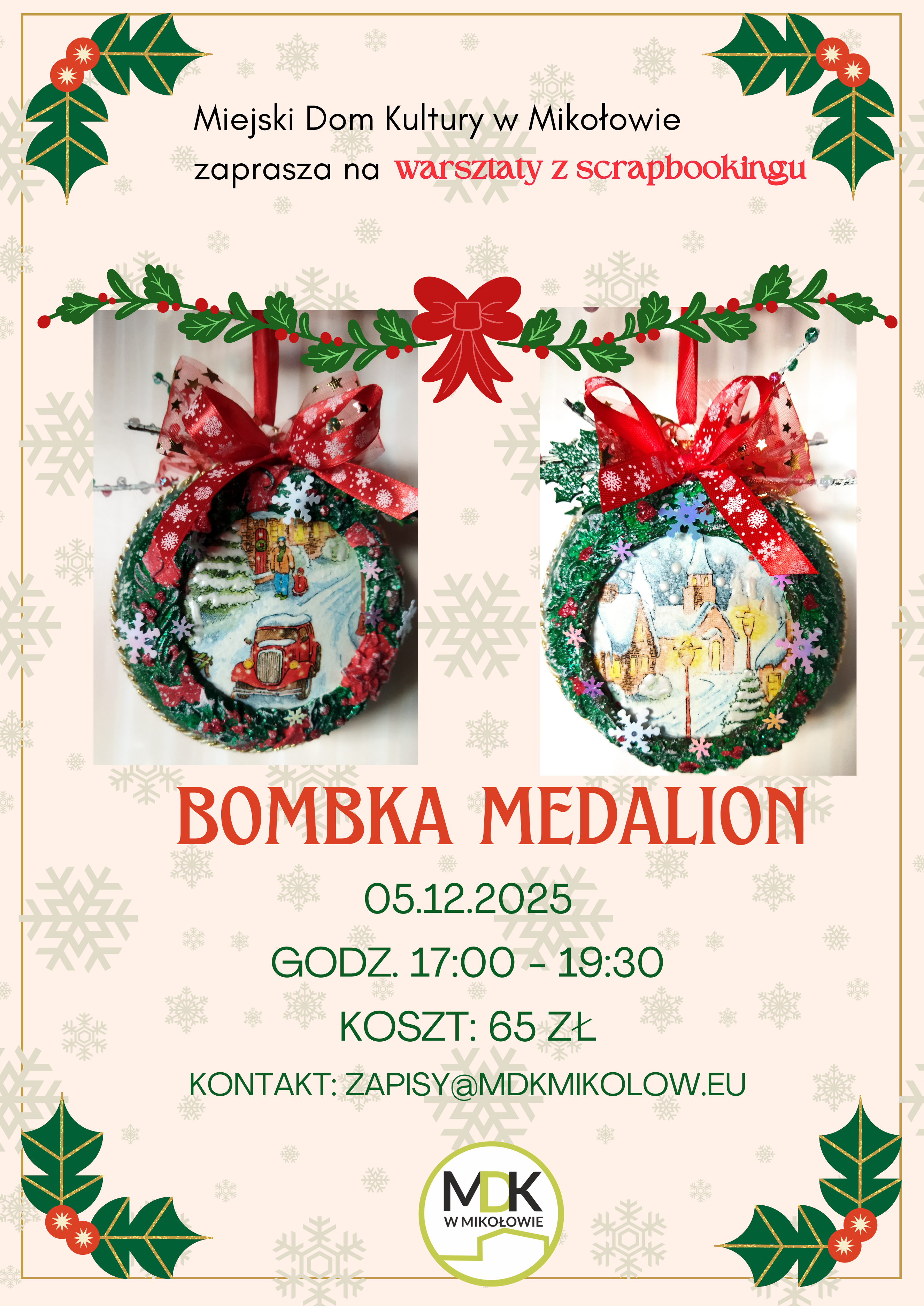 Podczas warsztatów wykonamy bombkę medalion o średnicy ok. 11 cm techniką decoupage, pomalujemy farbami akrylowymi i ozdobimy wyciskami z foremek, które również pomalujemy. Całość wykończymy brokatem, wstążkami i cekinami. Powstanie piękny, świąteczny projekt, który będziemy mogli umieścić na choince, jako dekorację domu lub wręczyć jako upominek świąteczny.