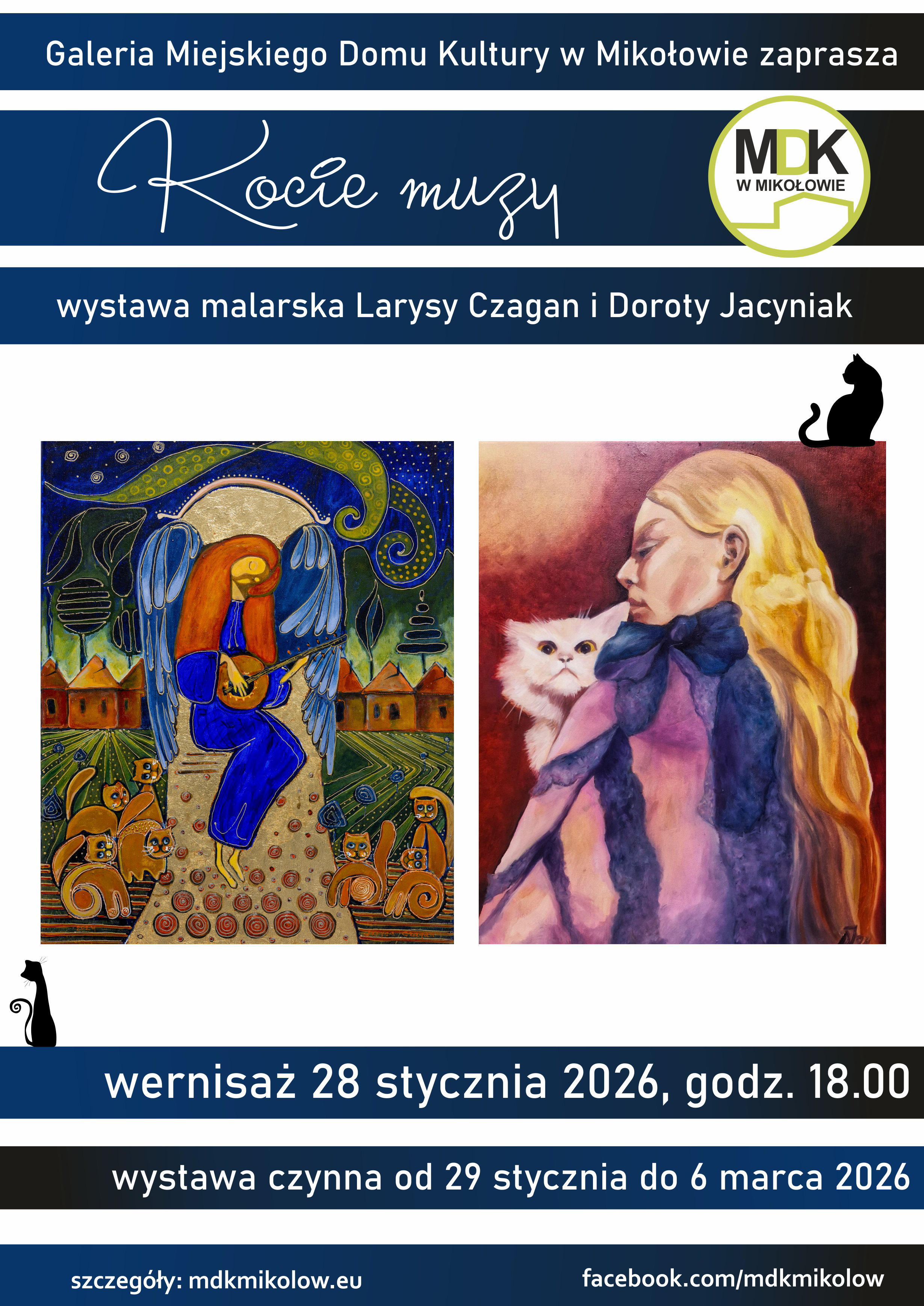 Od 29 stycznia do 6 marca zapraszamy do Galerii MDK na wystawę "Kocie Muzy" Larysy Czagan i Doroty Jacyniak. Wernisaż wystawy odbędzie się 28 stycznia o godz. 18.00.