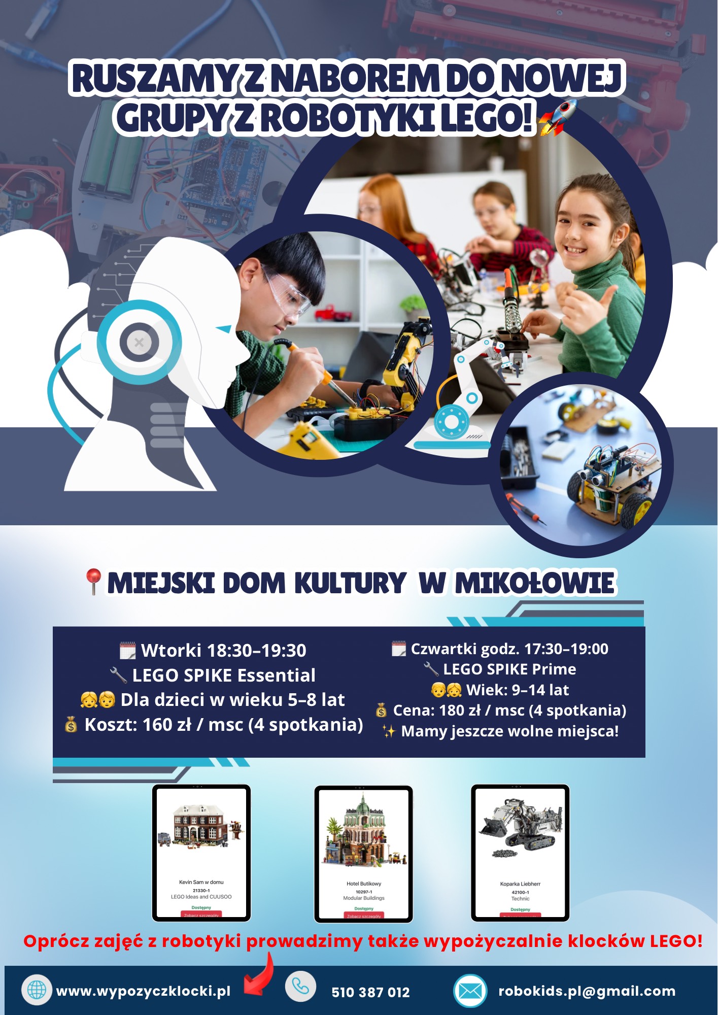 Zajęcia w dwóch grupach wiekowych: 6-8 lat (Lego Spike Essential) oraz 9-14 lat (Lego Spike Prime). Zapisy pod adresem mailowym robokids.pl@gmail.com oraz numerem telefonu 510-387-012.